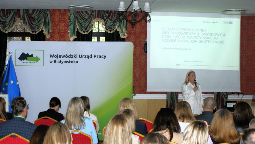 Część merytoryczną seminarium rozpoczął wykład prof. Urszuli Widelskiej z Akademii Łomżyńskiej. Zrealizowane przez zespół pracowników naukowych uczelni badanie skupiało się na analizie modeli i narzędzi działań promocyjnych funkcjonujących w naszym województwie szkół zawodowych oraz ocenie ich skuteczności. Badanie ukazało nie tylko kluczowe wyzwania w promowaniu szkolnictwa zawodowego w województwie podlaskim, lecz także wskazało konkretne działania, które mogą zwiększyć jego atrakcyjność i skuteczność: inicjowanie współpracy między szkołami a interesariuszami, wykorzystywanie mediów społecznościowych czy wdrażanie innowacyjnych strategii promocji i edukacji.